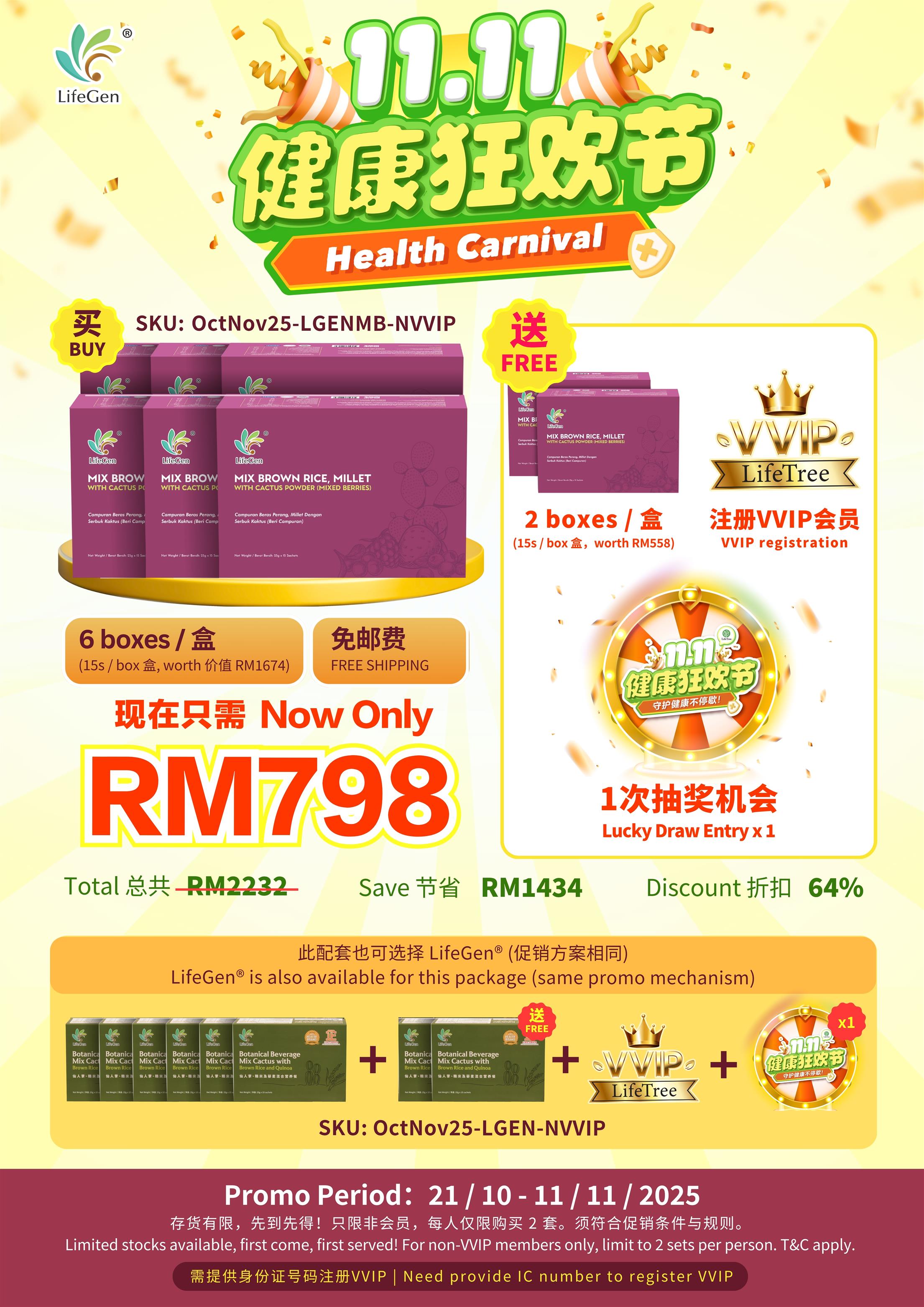 六盒 LIFEGEN MIX BERRIES 仙人掌营养餐 "双 11 健康狂欢节 21/10-11/11/25 ” 送两盒LIFEGEN+ 1次抽奖机会